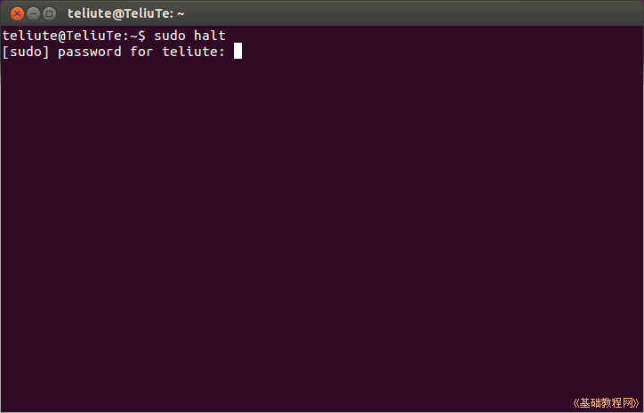 3)在提示符后面输入命令后,按一下回车键就可以执行命令,输入命令 sudo halt 然后按回车键是关机命令,sudo 是切换到管理员,要输入自己的密码,输的时候不显示,盲打输入后按回车键;