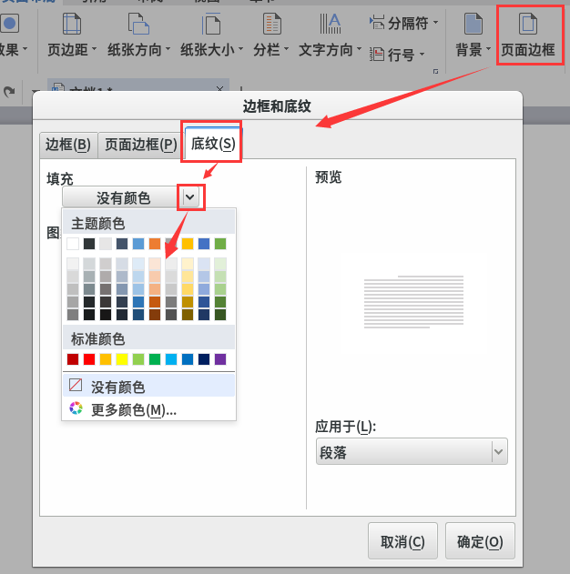 5、再点“页面边框 - 底纹 - 填充颜色”,给文字加上彩色;