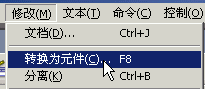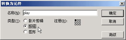 2)再点菜单“修改-转换为元件”,在出来的对话框中,将名称改为“play”,类型选择“按钮”,然后点确定,将文本转为一个按钮元件;