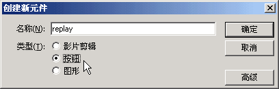 2)单击菜单“插入-新建元件”,在弹出的对话框中,将名称改为“replay”,类型选择“按钮”,单击确定;