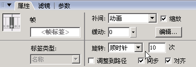 选中第一帧,单击鼠标右键,选择“创建补间动画”,在下面的属性面板中,设定顺时针旋转10次,保存一下文件;