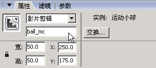 4)点击时间轴上面的“场景1”回到场景中,在库中拖一个“运动小球”元件到工作区,对齐到中央,在属性面板中把“<实例名称>”改为ball_mc ,