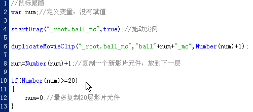 第6句是复制语句,复制20个新剪辑,第一个应该是“ball1_mc”,放在第1层中,依此类推;