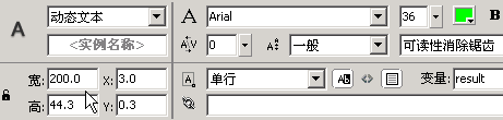 3)将文本框类型由“静态文本”改为“动态文本”,大小36、颜色绿色,“单行”不变,单击按下旁边的显示边框按钮