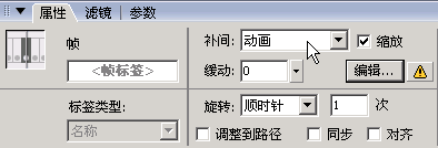 2)单击选中图层2的第15帧,然后在下面的“属性”面板中,按照从上到下的顺序,在“补间”里点一下鼠标左键,选择“动画”,在“旋转”旁的按钮上单击,选择“顺时针”,在“次”里输入1,让动画旋转一圈,