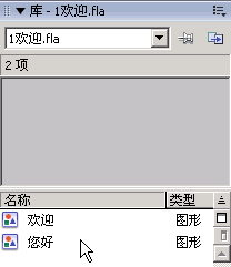 1)绘制图形:在窗口右边的侧栏里头看一下,我们刚才做的元件都在库中,有两个,“欢迎”和“您好”