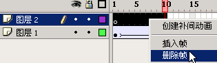 ,新建一个图层2,电脑自动产生10帧空白帧,要把它们都删掉,方法是点一下“图层2”,就会选中所有空白帧,然后在右边选中的帧上单击右键选“删除帧”命令;