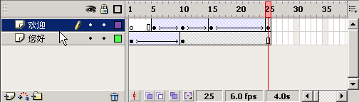 现在我们已经完成了动画的制作,按Ctrl+回车键测试一下动画的效果,是不是很有特色?欣赏完关闭返回,将“图层1”改为“您好”,“图层2”改为“欢迎”,保存一下,再测试一下;