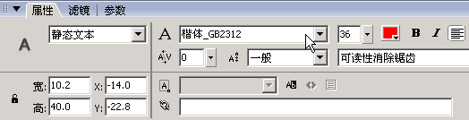 在下边的属性面板中,在中间一栏中,按照从左到右顺序,把字体为“楷体_GB2312”,尺寸为36,颜色为红色;