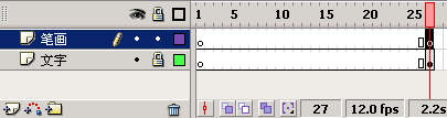 先在第27帧处插入空白关键帧,这时第1帧和第27帧上有一个小圆圈,表示它们是关键帧,其他帧都是过渡帧,