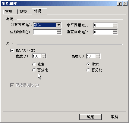 4)在弹出的对话框中,在上边选择“外观”标签,找到中间的“指定大小”打上勾,然后把下边的“象素”改为百分比,再把宽度改为100,旁边的高度10象素不变,百分比是为了跟网页的宽度一致;