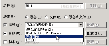 5)在第一个标签“源”的中间,找到“默认的视频设备”,点一下选择“屏幕捕获”,出来一个提示,点“确定”;