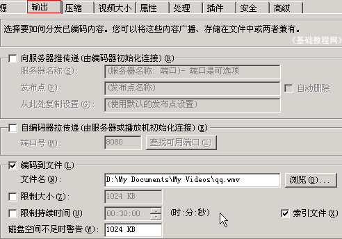 8)然后点上面的“输出”标签,在中间将“编码到文件”勾上,其他去掉,点右边的浏览,找到“我的文档-我的视频”,文件名设为“qq”;