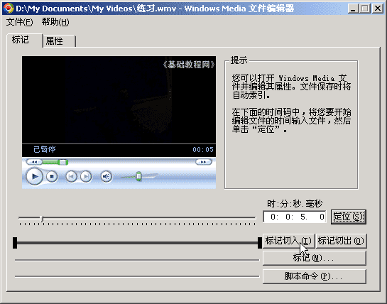 4)点一下左边的“标记切入”按钮,这个位置作为开始点,也可以在上边输入时间后,点“定位”精确到5秒的位置;
