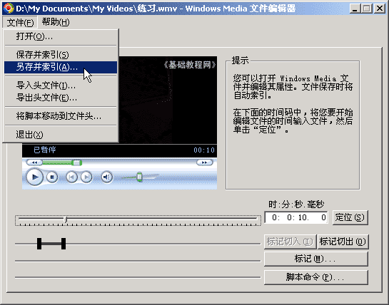 点菜单“文件-另存并索引..”,以“练习a”为文件名,保存文件到我的视频文件夹里,由于是另存,原来的文件还在;