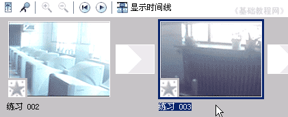 4)把“练习002”拖到下面的时间线上第一格里,把“练习003”拖到第二格里,这样就把这两小段视频连到一起了,