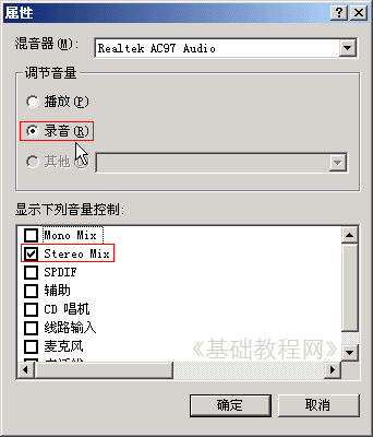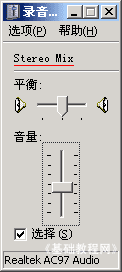 2)点菜单“选项-属性”命令,出来一个面板,在中间选择“录音”,在下面把混合立体声 Stereo Mix打勾,其他去掉点“确定”返回;