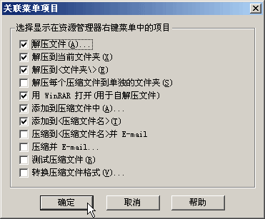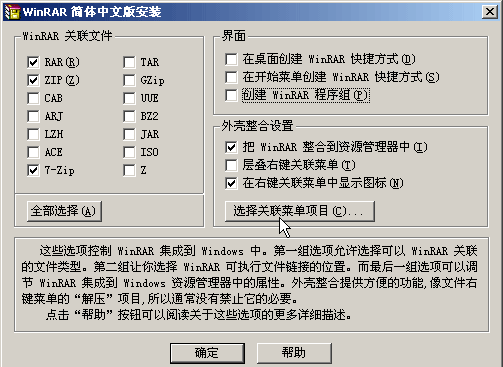 再把右边的“创建WinRAR程序组”的勾也点一下去掉,然后点它下边的“选择关联菜单项目...”;