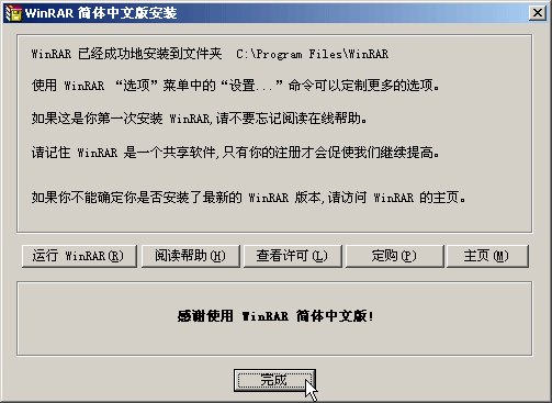4)点“确定”,出现最后的完成界面,这儿提示Winrar需要注册,如果有条件注册成正式版的,否则40天后,会出现提示框,点“完成”就安装好了;