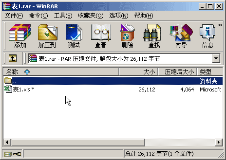2)窗口中显示的是压缩包里头的压缩文件,这儿只要一个“表1.xls”,后面的*号表示带有密码;