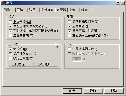 5)在菜单栏的“选项-设置...”菜单中,可以设置压缩软件的各个选项配置,