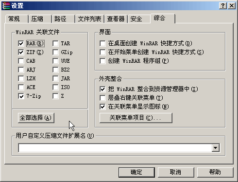 在上面的“综合”标签上点一下,就可以进入安装时,我们所进行的那些关联设置,如果当时没设,现在可以把它们设定好;