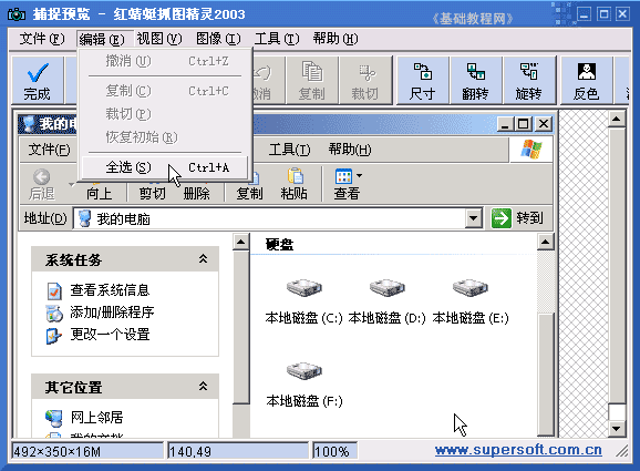 3)捕获的图像显示在一个编辑窗口中,点菜单“编辑-全选”命令,选中整个图形,